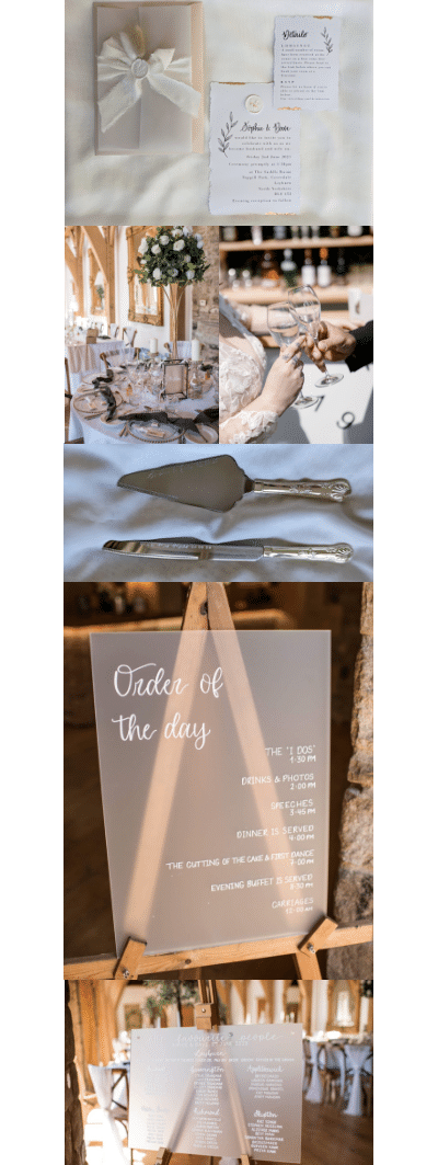 When I had an idea to have something made to hang table names from, Laura carefully and expertly used her wonderful calligraphy skills to bring my visions to life! All frosted acrylic and white handwritten calligraphy which Laura did beautifully!!! We were over the moon with these! We also kept the same theme running with our welcome sign, seating plan and order of the day! I finished off these with a chunky ribbon to finish off, also keeping this the same as our invitations and colour schemes. We also chose a specific coloured card and vellum for the most stunning elegant place names.