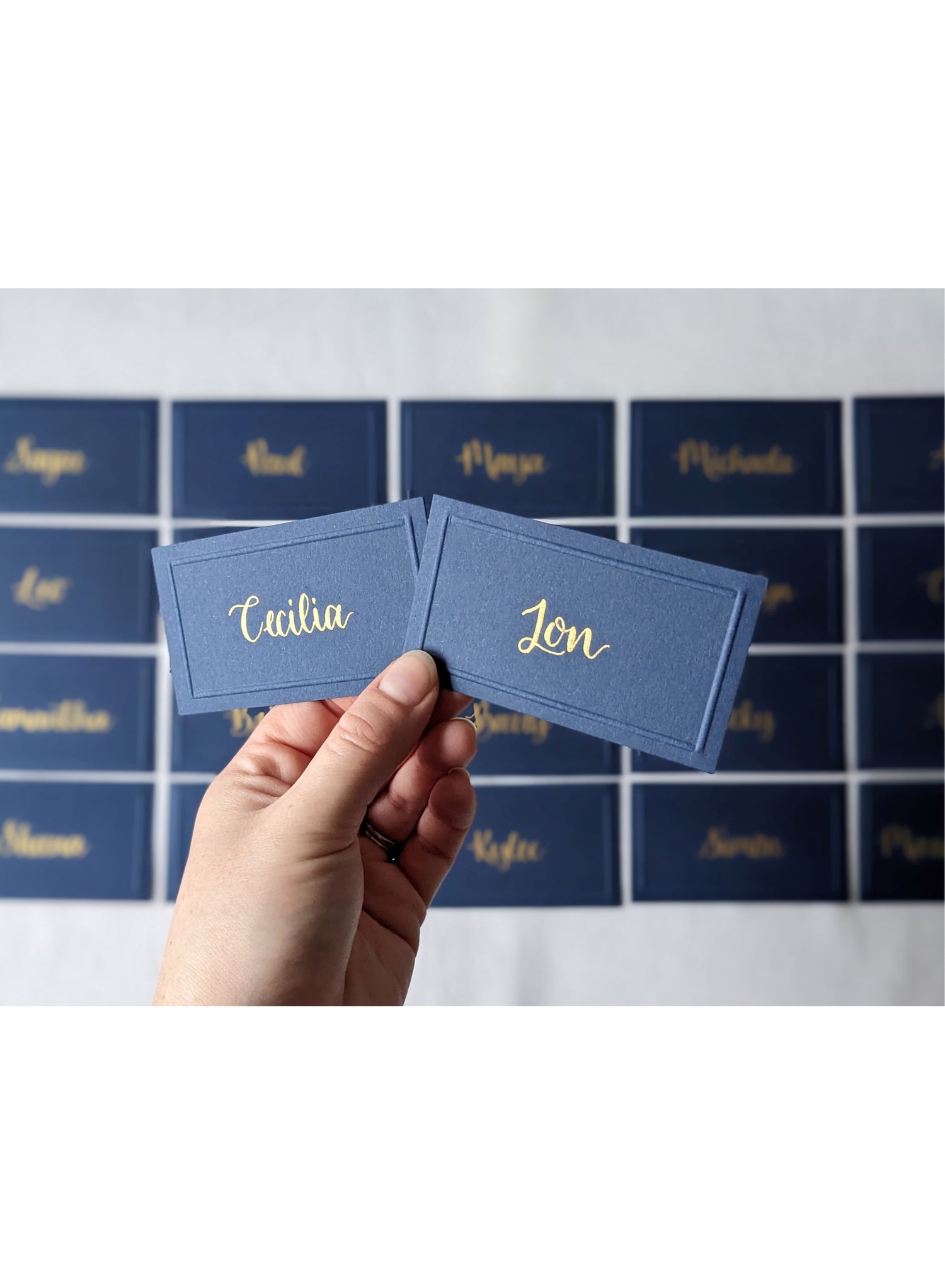 Table names/numbers and the title will be hand-written in calligraphy on card, with guest names in a block hand lettering styleΒ