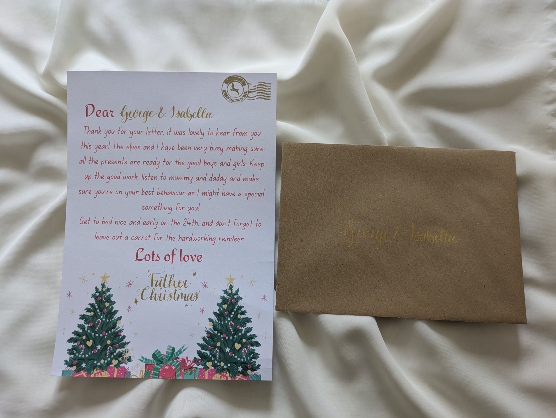 Each letter is A4 in size, has been stamped by a gold Christmas postal stamp, and will be finished with a C5 Kraft envelope and a foil embossed sticker. The child(ren)'s names will also be added to the envelope(s) in gold ink in my calligraphy style.