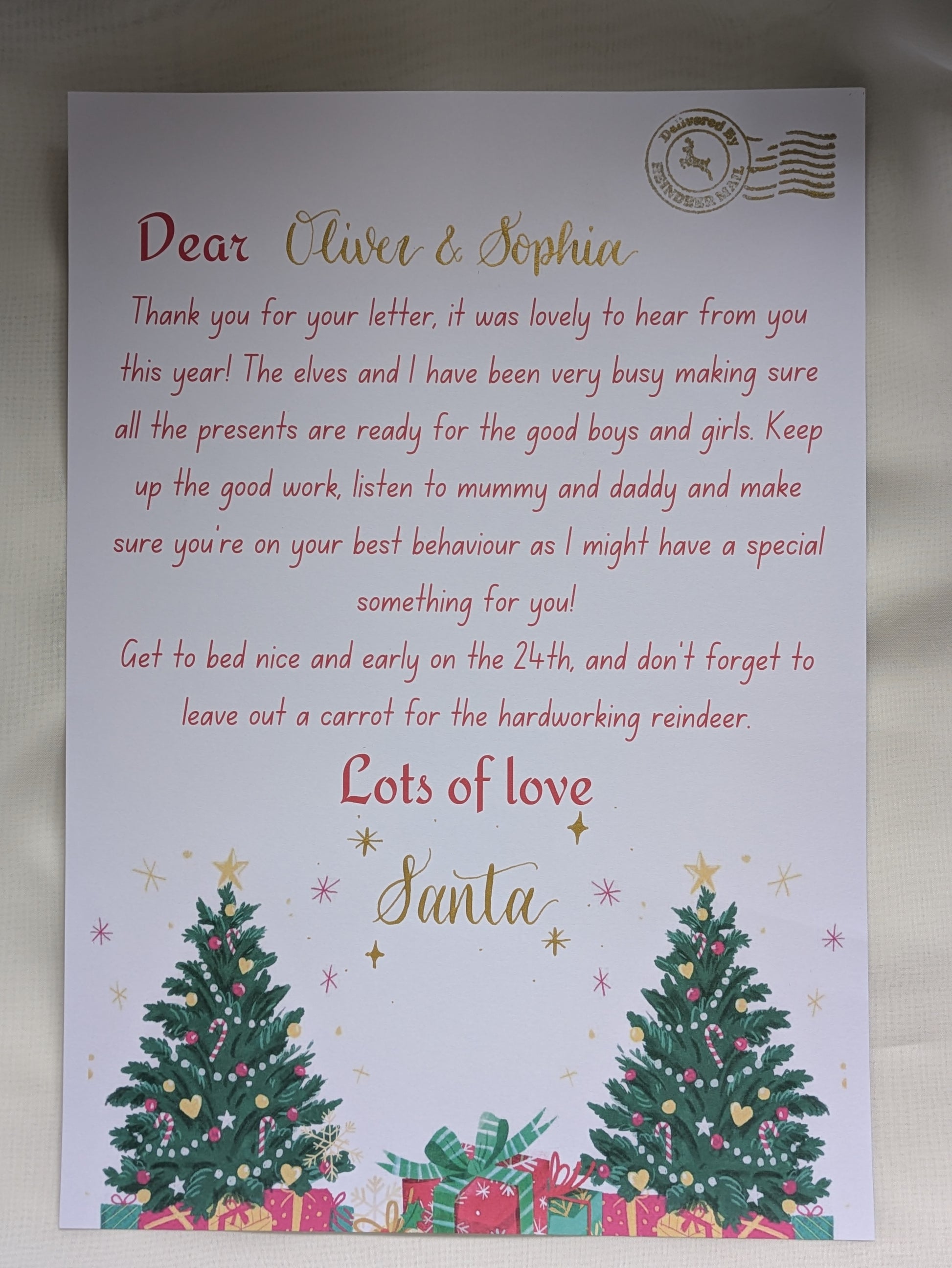 Up to 3 childrens' names can be added per Santa letter, with either "Santa", "Santa Claus" or "Father Christmas" signing off the letter on the Santa letter.